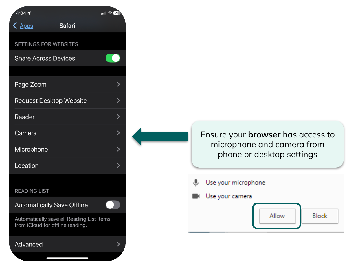 You may be able to find helpful troubleshooting tips for the browser you are using, which can guide you through enabling microphone and camera access. For example, this is the guide for the Google Chrome browser.